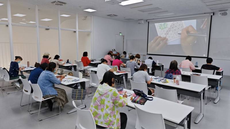 帶領學員認識禪繞畫,老師依據現場學員的程度來調整課程難易,從基礎到延伸的繪圖技法,每堂課程進行圖案解析,本期中國代表圖案"太極"為創作主題